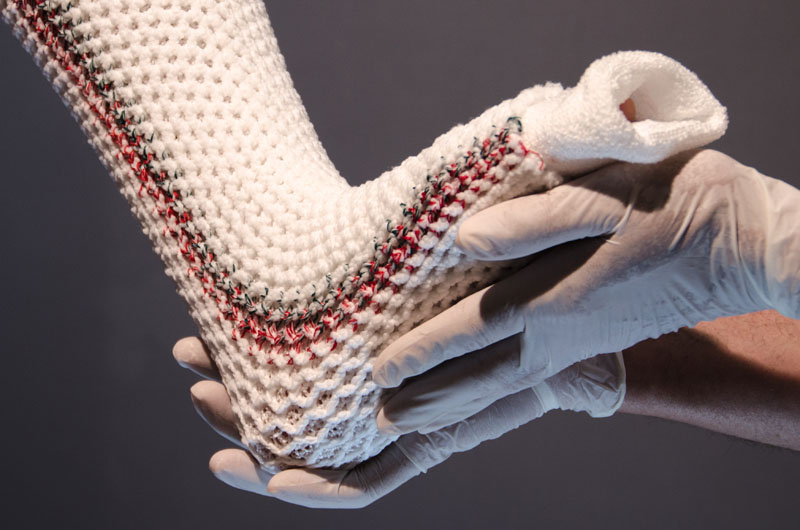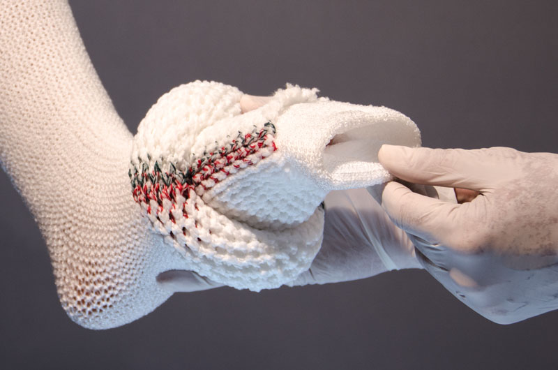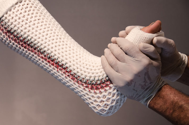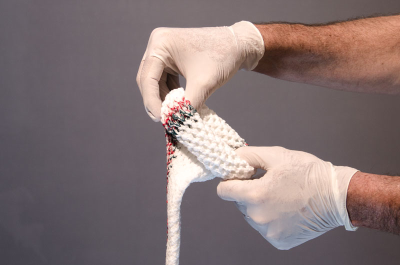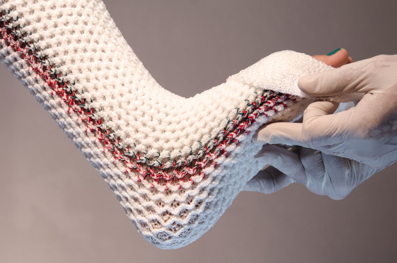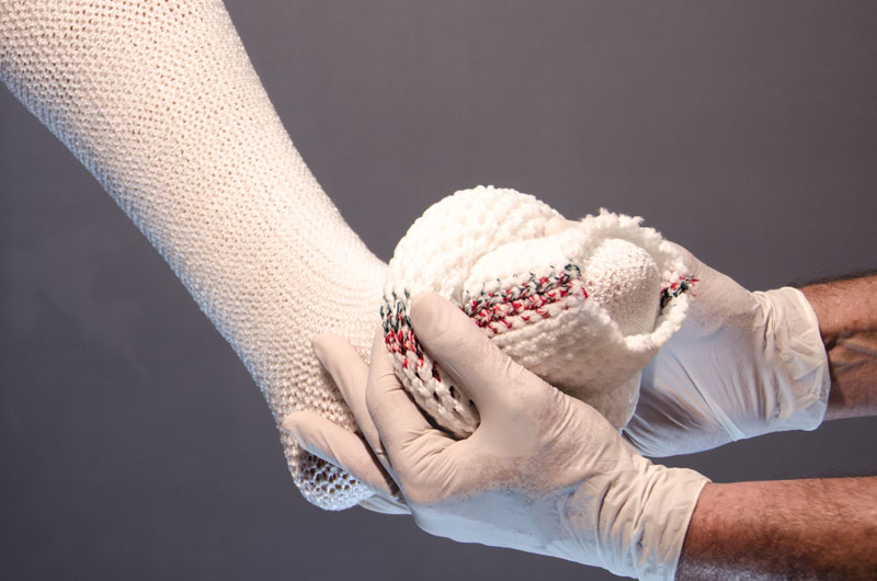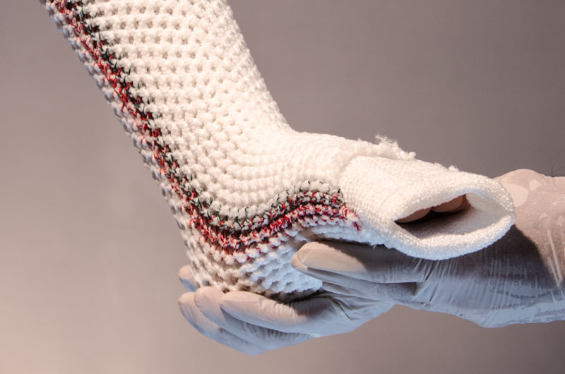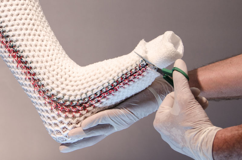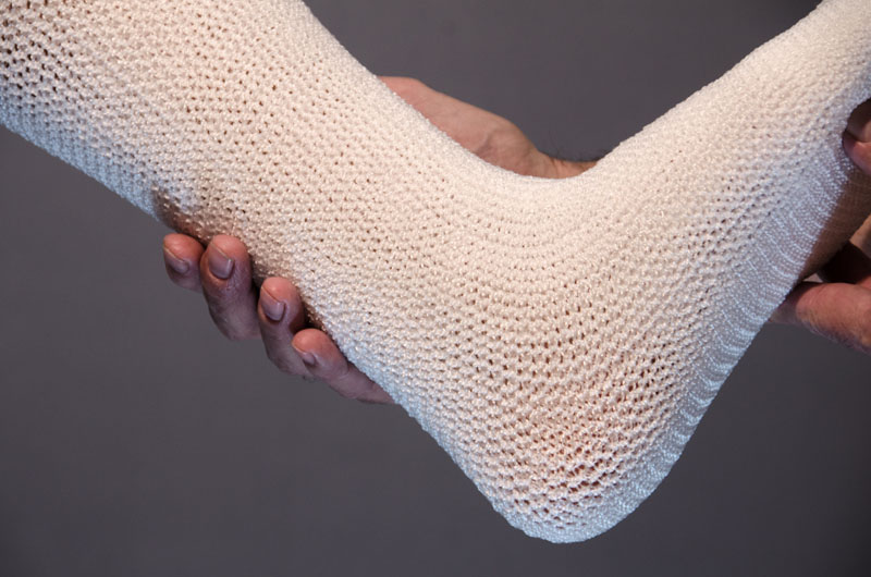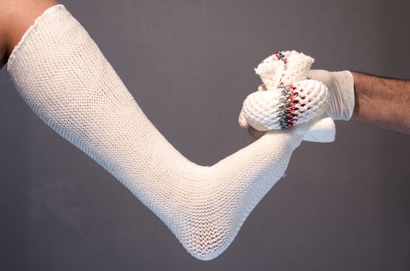 - Because the ankle is bent at a 90 degree angle, it is best to try and avoid folds in the external sleeve (unlike other casting products, Magicast folds will hardly be felt by the patient. However, it is still best to avoid them). For this purpose, unroll the sleeve onto the ankle by holding the doughnut with both hands, fixing the inner side in place and stretching the outer side (the heel) over the ankle. Stretching the heel side creates a more widely spaced mesh than placing the same mesh over the ankle side. Then, continue unrolling the sleeve all the way to below the knee, as before.