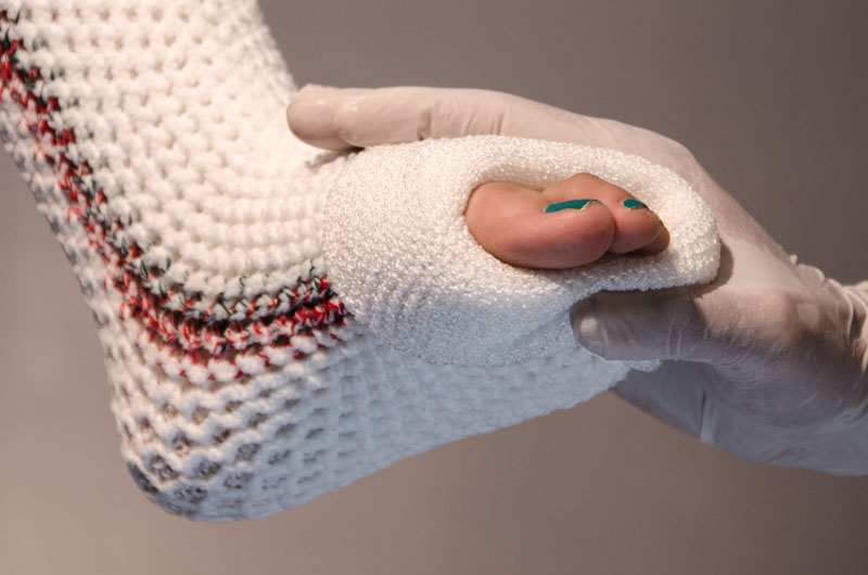 - Stretch the doughnut again, fold the excess of the padding sleeve so that it is caught during the fitting of the hardening sleeve and begin fitting the hardening sleeve over the leg. Adjust the edge of the sleeve as desired in relation to the bases of the patient’s toes and continue unrolling the sleeve onto the foot, until just below the ankle.