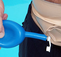 The ostomy protector is made of durable rubber (contains latex) that can be stretched to up to 6 times its original size. Shaped like a belt, the protector’s openings are narrower than the area it covers. This helps the protector fit tightly onto the abdomen and seal it completely. The pump that comes with the protector sucks the air from inside it through a special valve, tightening it around the abdomen and creating a vacuum. The vacuum also makes it difficult for the patient to remove the protector while in the water, and makes any air that enters the belt very easy to spot.
